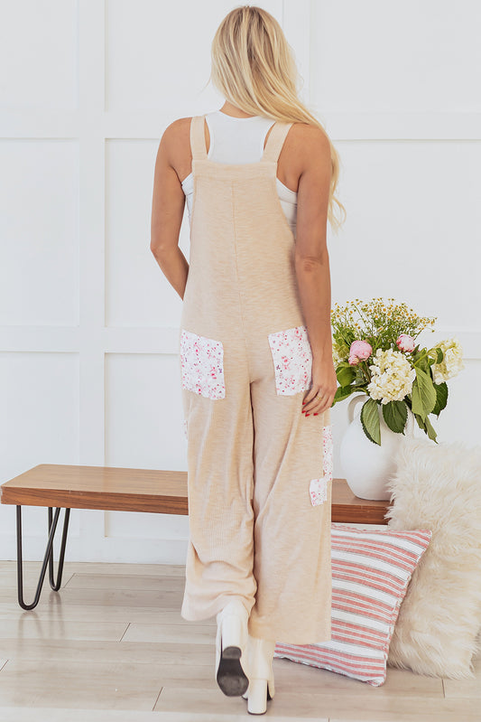 Jet Stream Floral Patchwork Ribbed Side Pockets Wide Leg Jumpsuit
